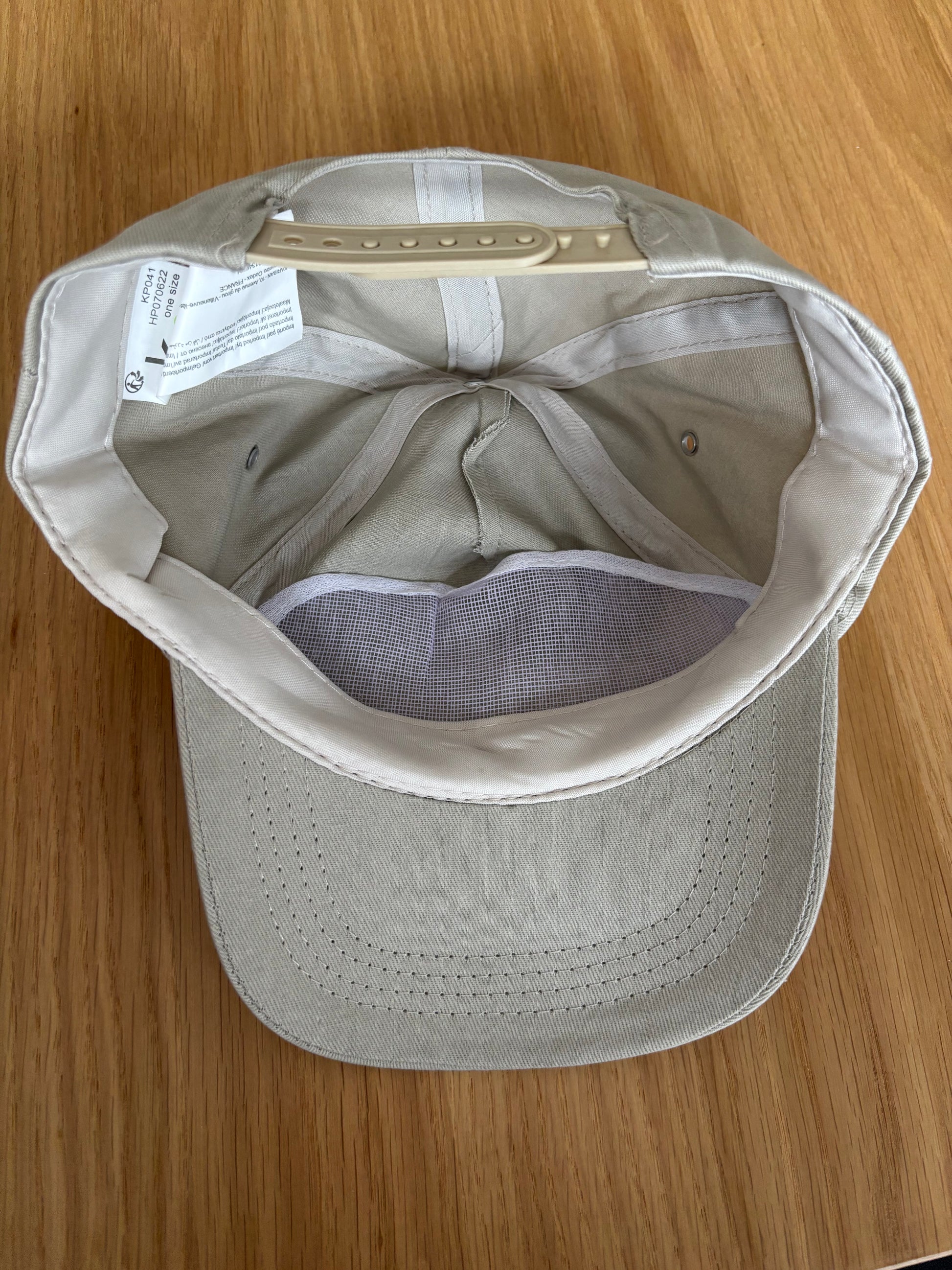 De naam wordt gedrukt aan de voorzijde van deze zandkleurige pet die achteraan verstelbaar is. De pet is vooraan niet verstevigd, dus valt soepel.