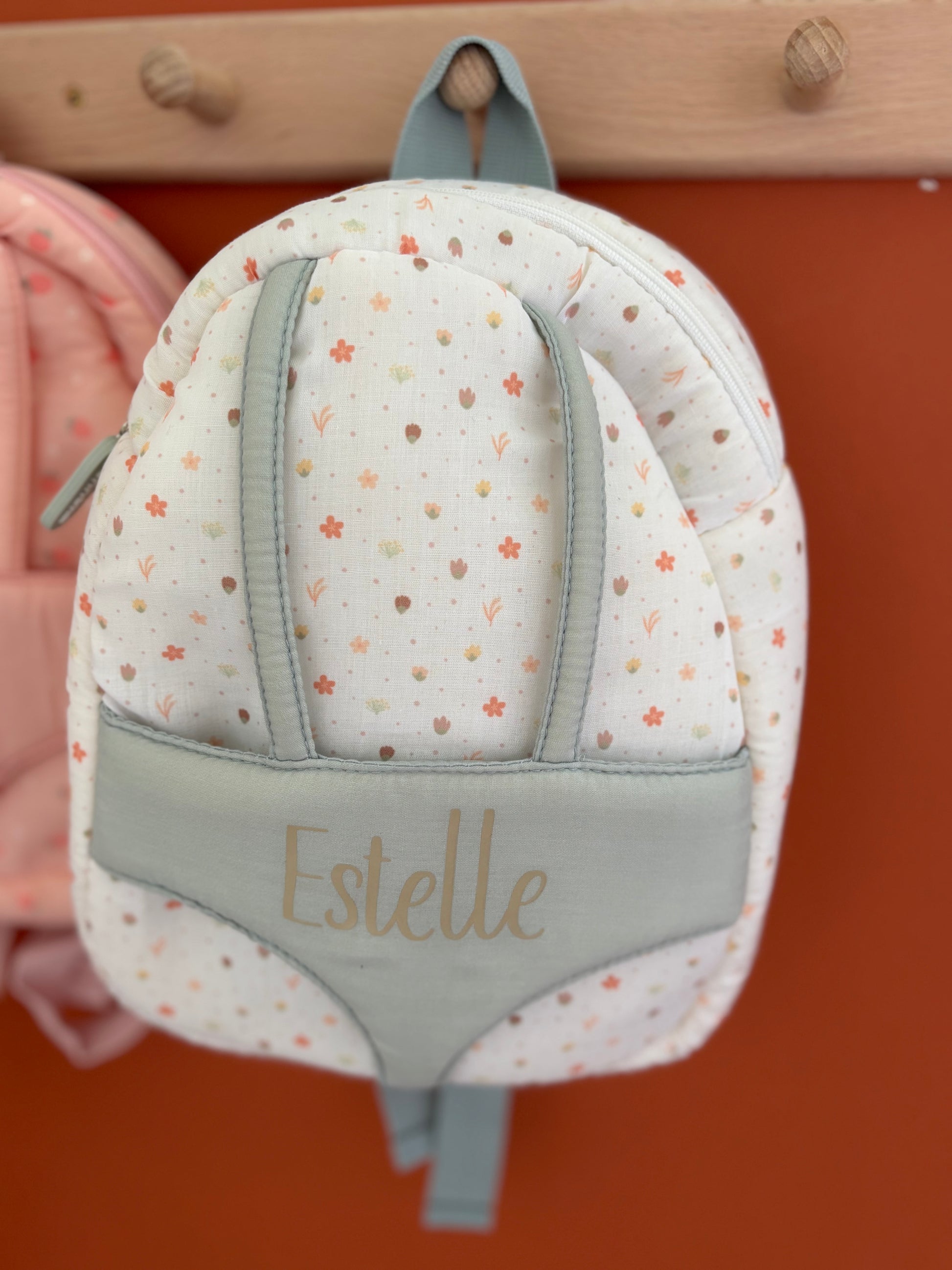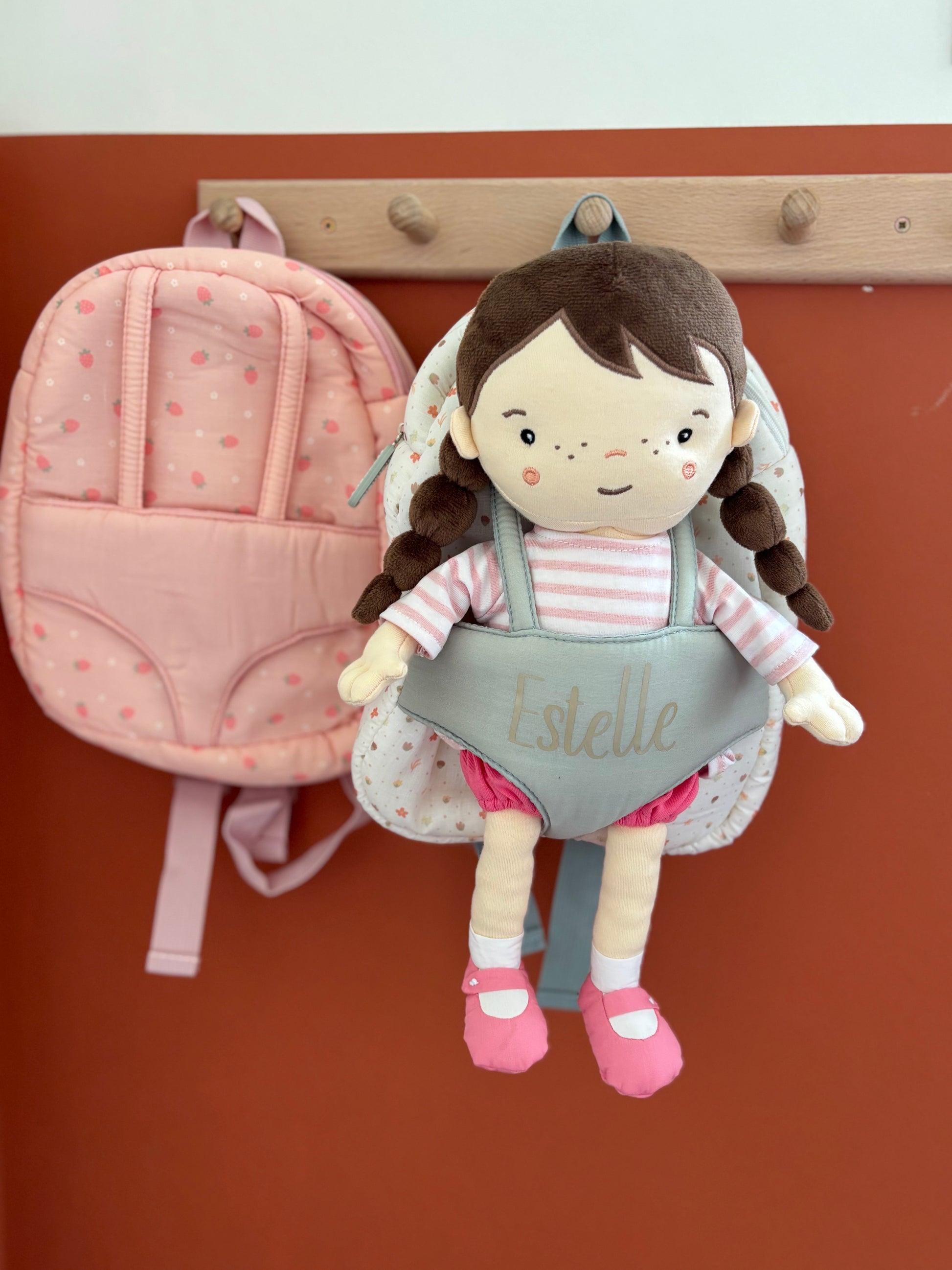 Als je kiest voor personalisatie komt de naam vooraan op het draagstukje voor de pop.